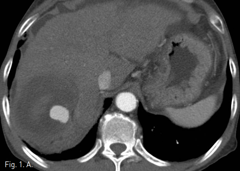 환자는 heavy alcoholics인 분으로 외부병원에서 건강 검진상 시행한 복부 초음파와 복부 전산화 단층촬영에서의 이상소견으로 본원으로 전원 됨. 외래에서 시행한 복부 전산화 단층촬영상 간 우엽에 혈종과 내부에 가성동맥류 소견 보여 추가적인 검사와 치료 위해 입원예정 이었으나 입원 예정일 전날 갑자기 발생한 우상복부 통증으로 응급실로 내원함. 내원 당시 혈압은 100/60mmHg였고 기타 생체징후는 특이소견 없었음.