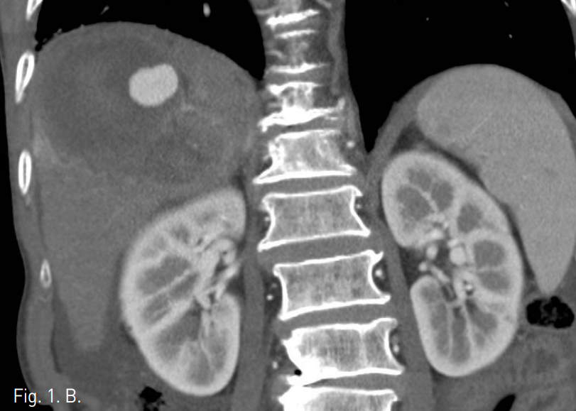 A, B. Axial (A) and coronal (B) CTimages of arterial phasereveal high density pseudoaneurysm and surrounded low density hematoma in the right lobe of the liver.