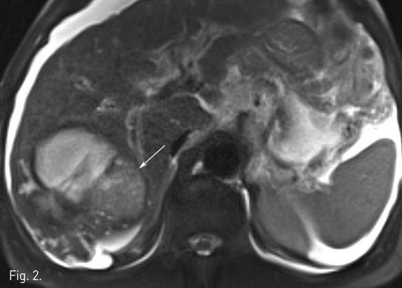 Axial T2-weigh ted MR image shows high density hematoma and adjacent hepatoma (arrow).