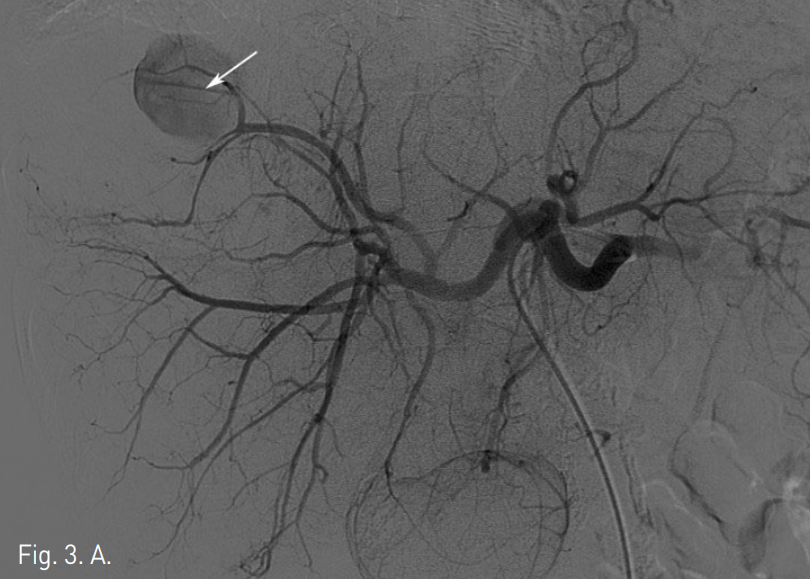 A. Celiac arteriogram shows pseudoaneurysm with jet flow (arrow) from right posterior superior hepatic artery.