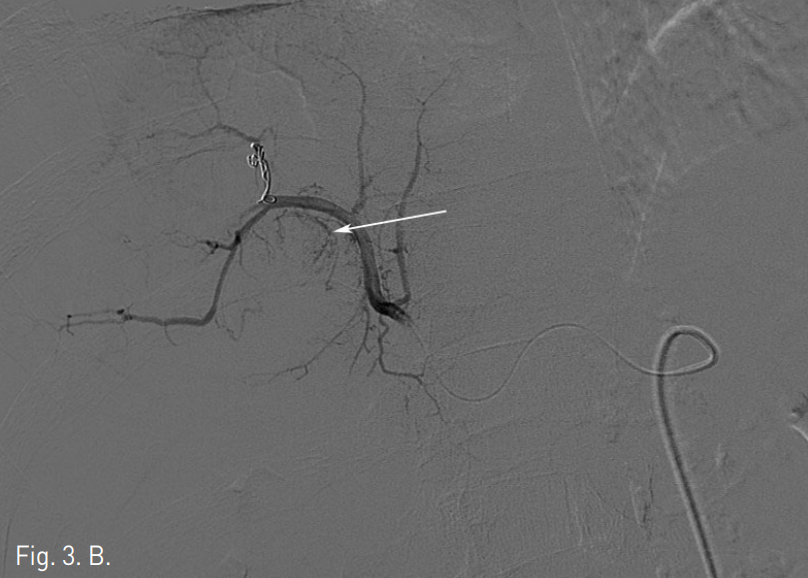 B. Right posterior hepatic arteriogram after coil embolization shows no extravasation with pseudoaneurysm. Hepatoma is supplied by just proximal arterial branches (arrow).
