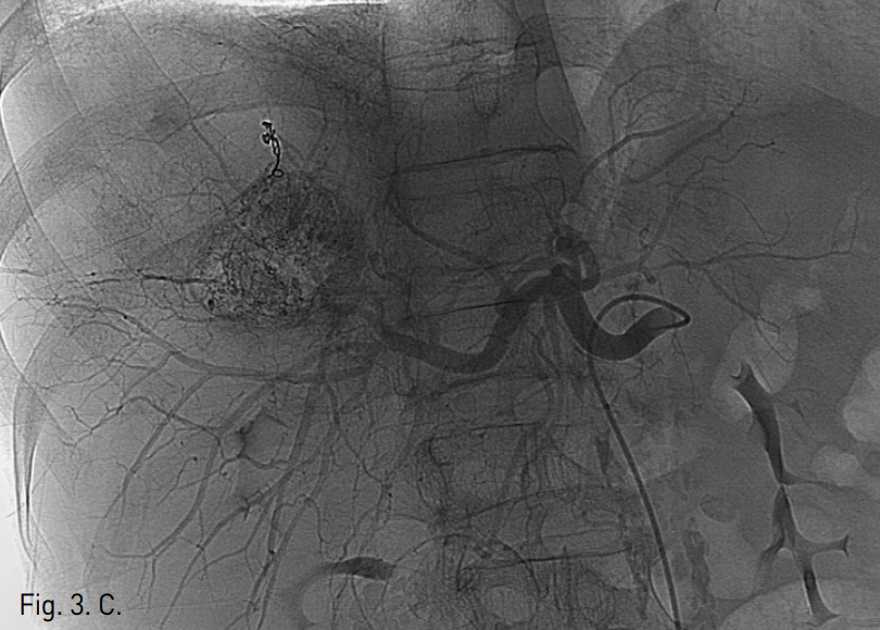 C. Fluoroscopic image after coil and chemoembolization shows dense lipiodol uptake in the right postero-superior lobe of the liver.
