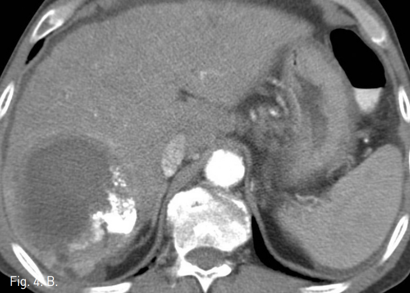 시술 2개월 후 시행한 조영증강 복부CT에서 우 간동맥에 의한 간내 가성동맥류는 보이지 않았고, 혈종은 약간 작아진 상태로 여전히 남아있었다(Fig. 4A). 간내종양은 lipiodol이 침착된 상태로 재발의 소견은 없었다(Fig. 4B).