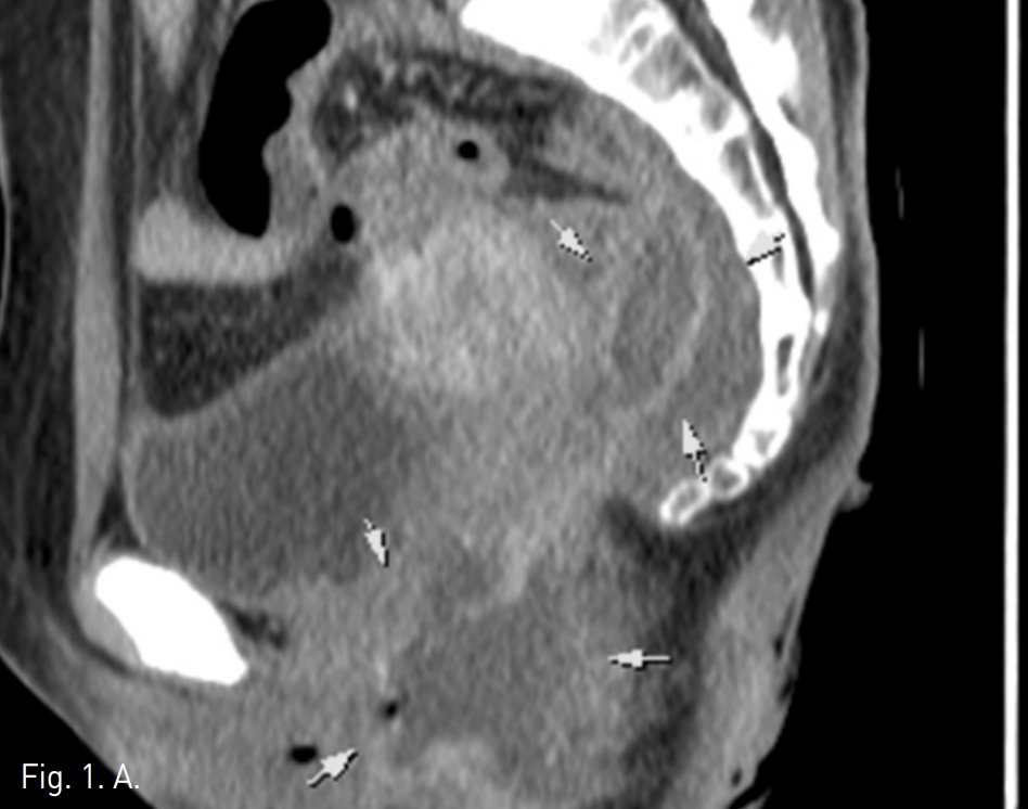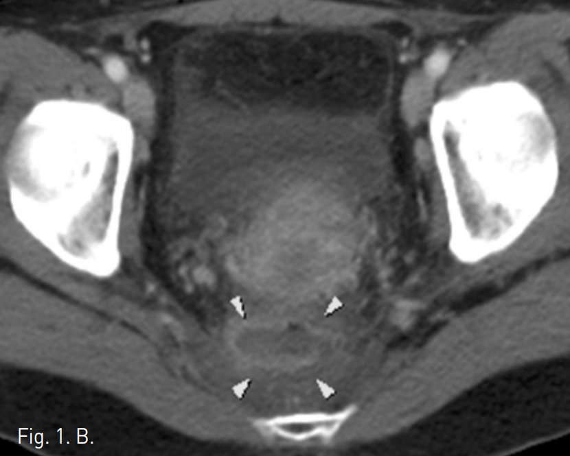 수술 후 15일째 시행한 조영 증강 CT에서 3-5번 천골(sacrum)의 전방으로 약 37x34x15mm크기의 납작한 모양의 액체저류가 관찰되었다. 항문 주변에 45x43x27mm크기의 또 다른 액체저류가 관찰되었다 (Fig. 1).