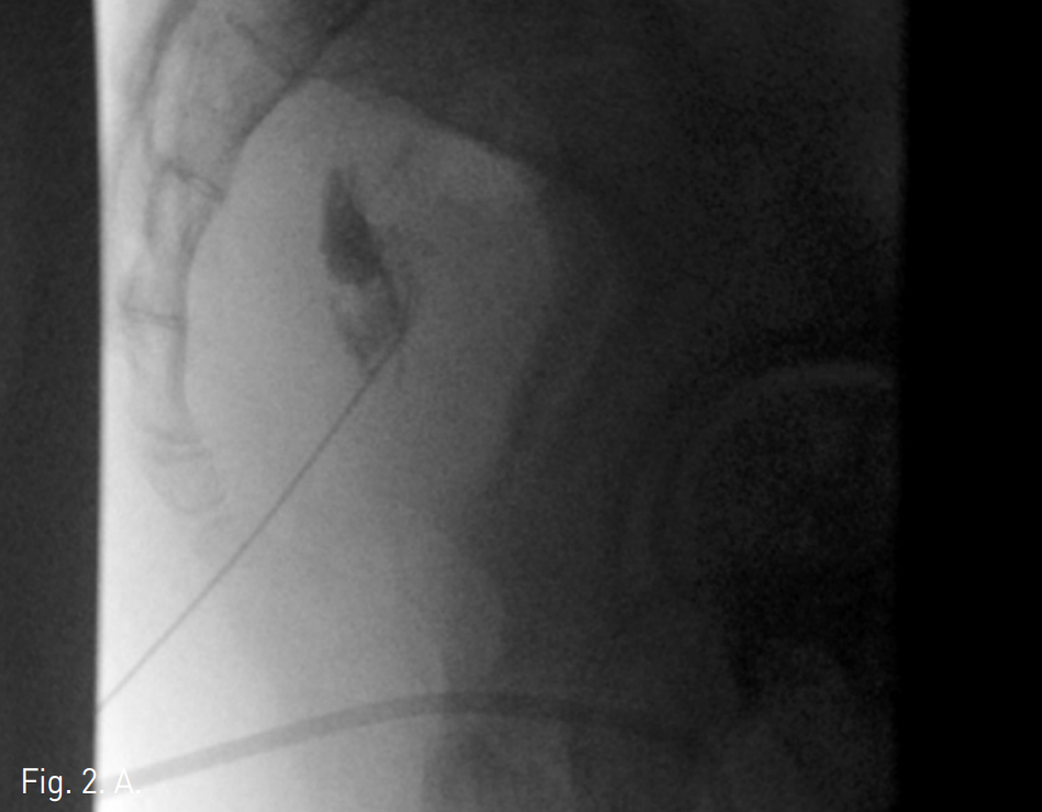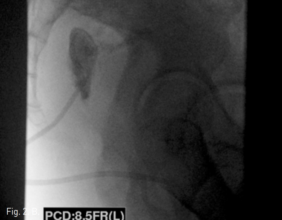 환자를 옆으로 눕게 한 후 천골과 꼬리뼈(Coccyx)를 만져서 확인하였으며 신경혈관다발과 이상근 (piriformis muscle)의 손상을 방지하고자 최대한 천골에 가깝게 천자부위를 정하였다. 시술직전 fentanyl 0.1mg/2mL를 수액에 섞어 주었다. 천자부위와 주변부를 소독하고 5mL정도의 리도카인으로 피하지방층과 대둔근의 배액관이 삽입될 부위를 마취하였다. 초음파 유도 하에 최대한 천골에 가까운 부위에 21G 바늘(Chiba needle, Cook, Bloomington, USA)를 삽입하고, 투시 유도 하에 대둔근을 통하여 천골 전방, 직장주위의 액체 저류에 삽입하고 천천히 흡인하면서 역류를 확인하고, 조영제를 주입하여 병변을 확인 하였다(Fig.2A). 미세유도 철사와 5F sheath, 유도철사를 차례대로 삽입하고 경로를 확장한 후, 8.5F 배액관을 천골 전방 액체저류 병변에 삽입하였다. 초음파 유도 하에 같은 방법으로 항문주변의 액체저류 병변에 8.5F 배액관을 삽입하였다. 마지막으로 투시 유도 하에 측면과, 후전면을 촬영하여 카테터의 위치를 확인하였다(Fig.2B).
