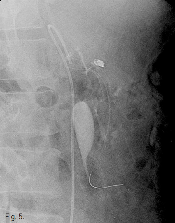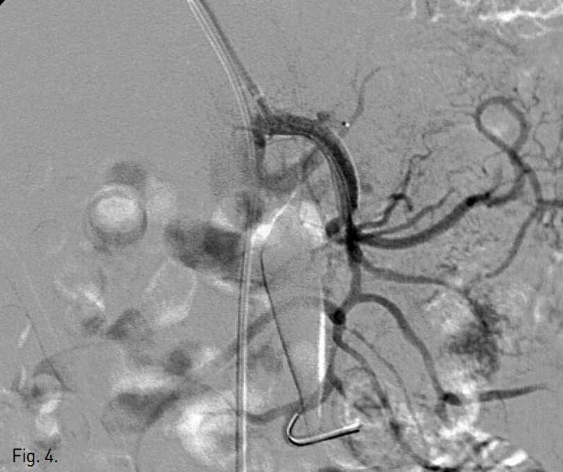 이어서 초음파 유도 하에 우측 상완동맥을 micropuncture introducer set (Cook, Bloomington, IN, USA)으로 access 후 6F sheath(Terumo, Tokyo, Japan)를 거치하고, 6F multipurpose guiding catheter (MPA1, Cordis, Miami, FL, USA)를 사용하여 상장간막동맥 기시부에 접근하였다. 이를 통해 0.014 inch microwire를 상장간막동맥 jejunal branch까지 insertion하고, microwire를 따라 6mm x 4cm self expandable stent (Precise PRO Rx, Cordis, Miami, FL, USA)를 dissecting aneurysm 입구를 포함하여 상장간막동맥 근위부에 deploy하였다(Fig. 4).