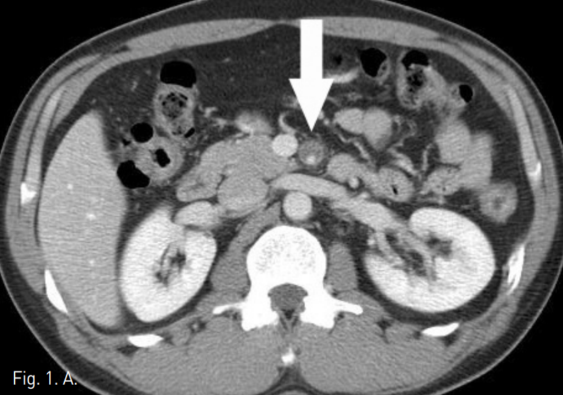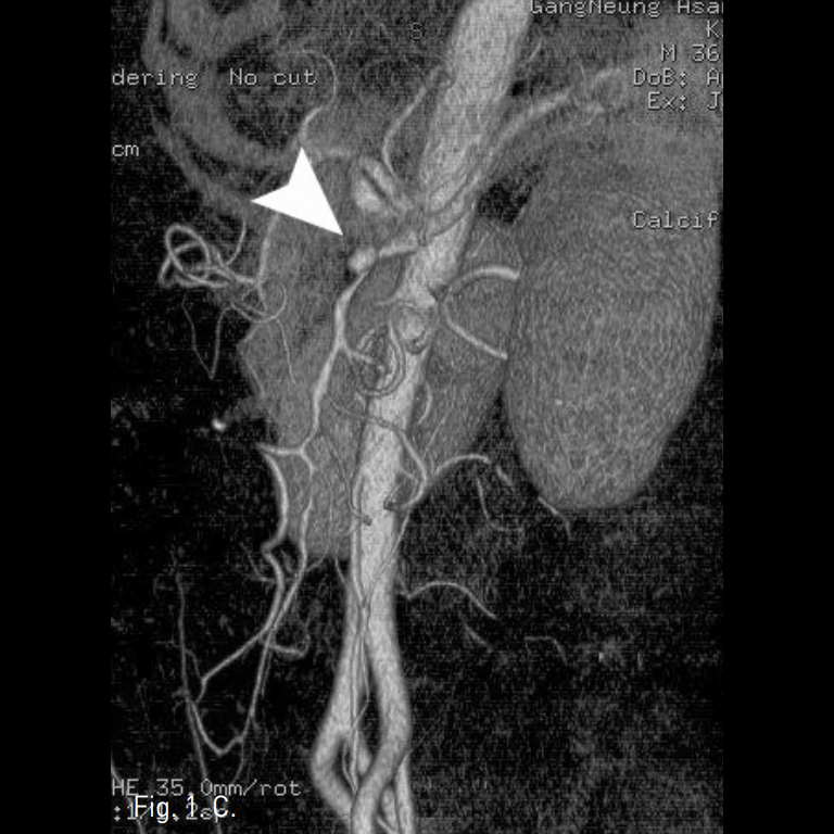 1개월 전 급성복통으로 내원하여 시행한 복부 CT상 상장간막동맥에 벽내혈종이 관찰되어 보존적 치료 후 임상 호전되어 퇴원하였던 환자로, 추적 복부 CTA상 벽내혈종의 진행과 박리성동맥류가 발생하여 치료가 의뢰되었다.