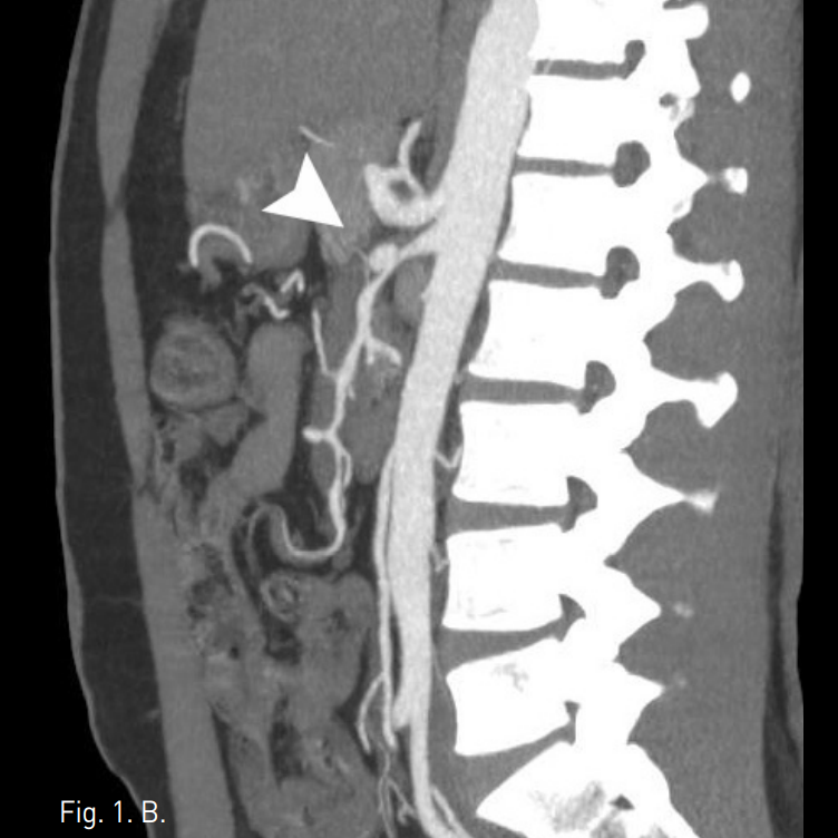 A, B. Oblique sagittal reconstructed MIP image (A) and volume rendered 3D CTA (B) obtained 1 week after procedure reveal patent SMA with decreased intramural hematoma and no residual filling of contrast media at the embolized aneurysm.