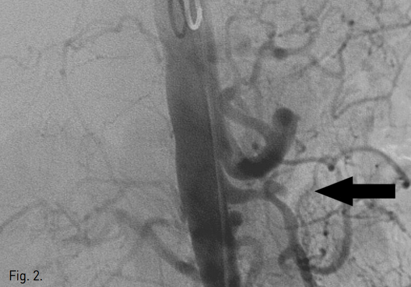 우측 대퇴동맥에 5F sheath (Terumo, Tokyo, Japan)를 삽입 후 5F pig-tail catheter (Cook, Bloomington, IN, USA)로 복부대동맥조영술을 시행하였다. 대동맥조영술상 상장간막동맥 근위부에 dissecting aneurysm이 관찰되었고 상장간막동맥은 patent하였으나 intramural hematoma로 인해 luminal narrowing 소견을 보였다(Fig. 2).