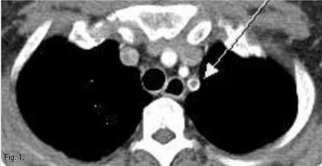 입원 3일 후 시행한 상지 CT 소견 상 left subclavian artery의 기시부에 약 3cm 길이의 thrombus가 보이며, 이 혈전은 aortic arch로 약 0.5cm 이상 튀어나와 있는 형태를 보였음(Fig. 1). 그리고 left radial artery와 left ulnar artery에도 thromboemboli가있음 (Fig. 2).