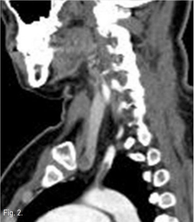 CT scan revealed 3cm sized partial thrombusprotruding into the aortic arch in origin of the left subclavian artery on axial(1, arrow) and sagittal scan (2).
