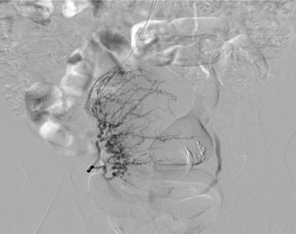 이후 신체검진에서 질출혈의 양은 감소하였으나 소량의 질출혈이 지속되었다. RUC catheter로 좌측 외장골동맥을 선택한 후에 시행한 혈관조영술상에서 좌측 자궁원인대동맥(round ligament artery)이 커져 있음을 발견하였다. 좌측 자궁원인대동맥조영술에서 좌측 자궁동맥의 원위부가 조영됨을 확인하였고, gelfoam을 이용하여 좌측 자궁원인대동맥의 색전술을 시행하였다. 이후 신체검진에서 질출혈은 소실되었다.