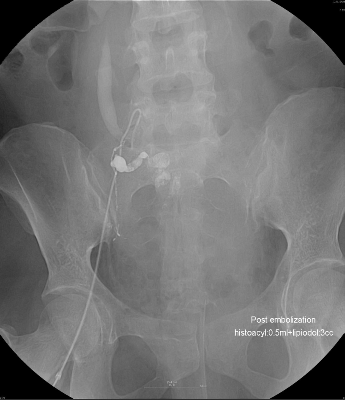 The pelvic radiograph shows tubular and linear radiopaque casts of NBCA/lipiodol mixture within the right uterine artery, pseudoaneurysm, and extravasation area.