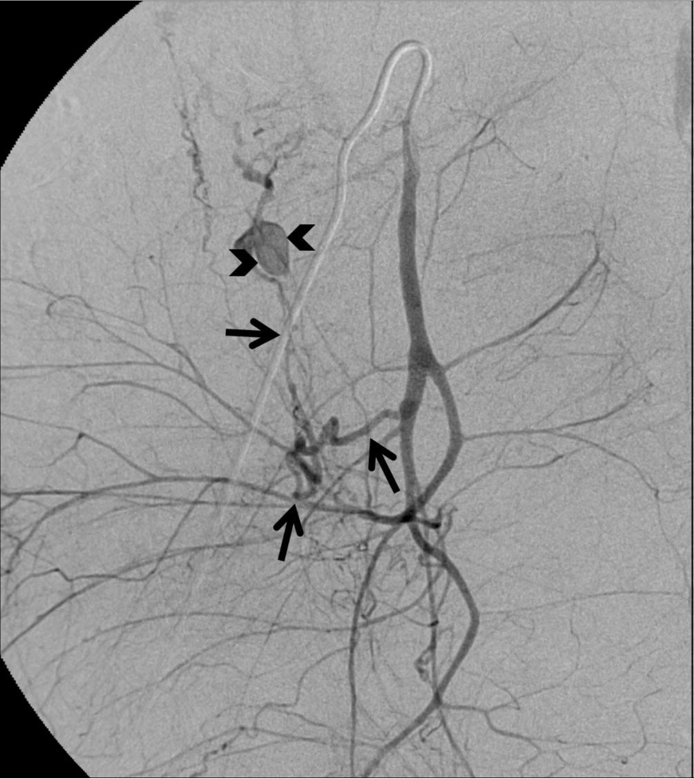 Right internal iliac angiogram with left anterior oblique projection shows very tortuous and dilated right uterine artery (arrows) and formation of pseudoaneurysm (arrowheads).