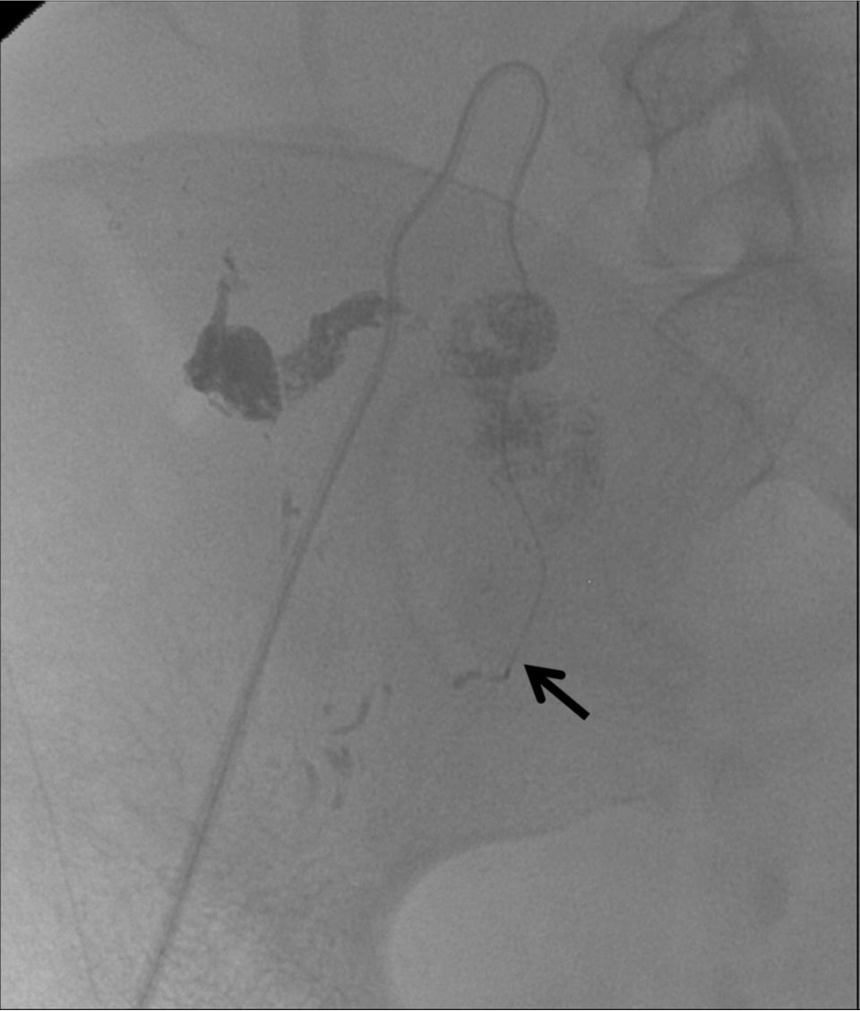 Pseudoaneurysm and extravasation spaces are filled with the mixture of NBCA and lipiodol during injection. Note the tip of a microcatheter in the proximal portion of the right uterine artery (arrow).