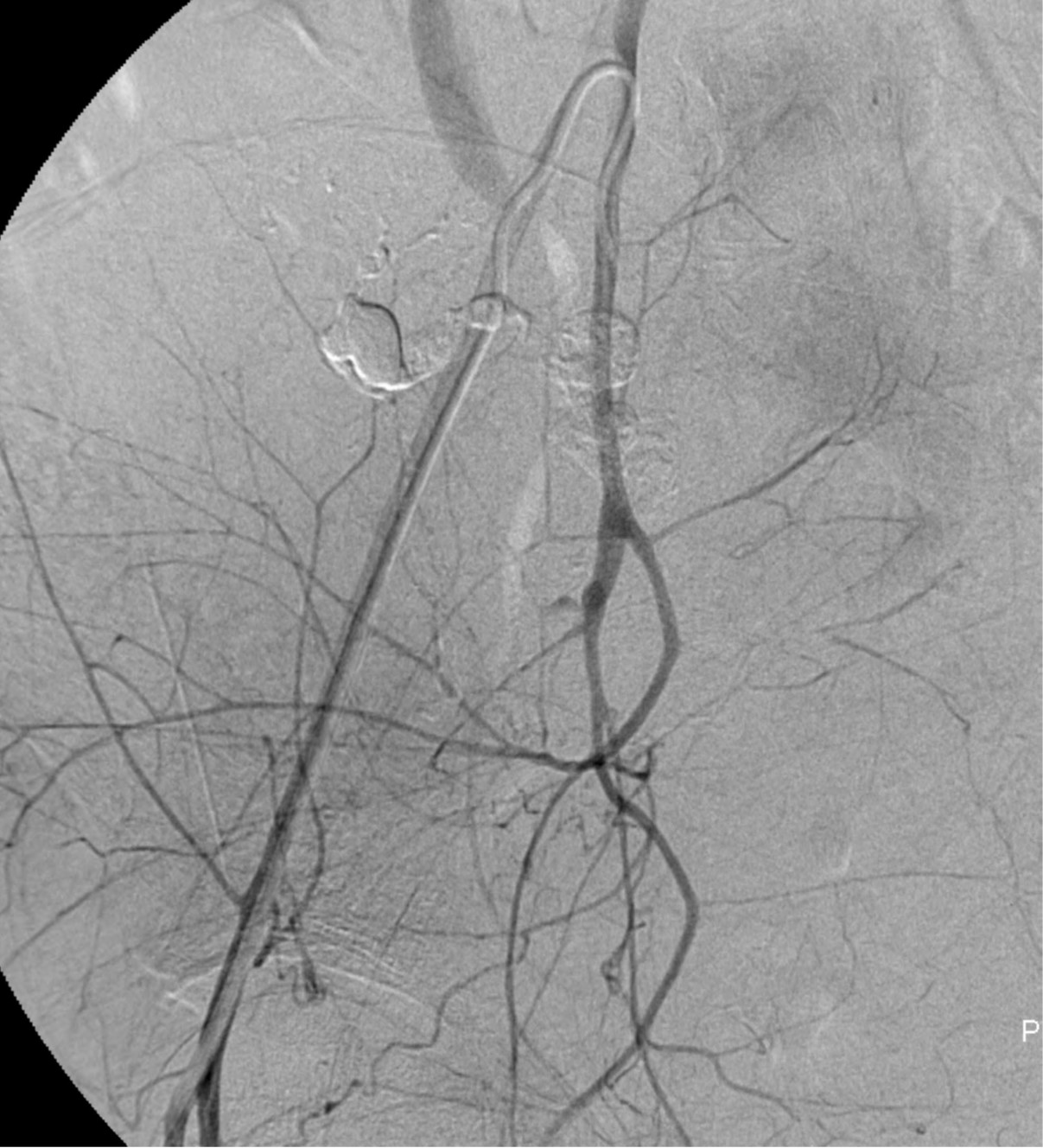 Pseudoaneurysm in the right uterine artery is no longer seen on the right internal iliac angiogram after embolization.