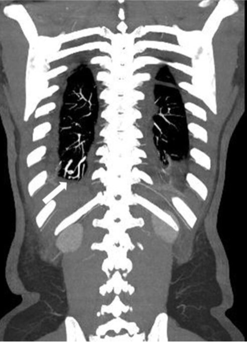 Fig. 1. Coronal contrast-enhanced chest CT image shows a small pulmonary arteriovenous malformation (arrow) in the posterior basal segment of the right lung.