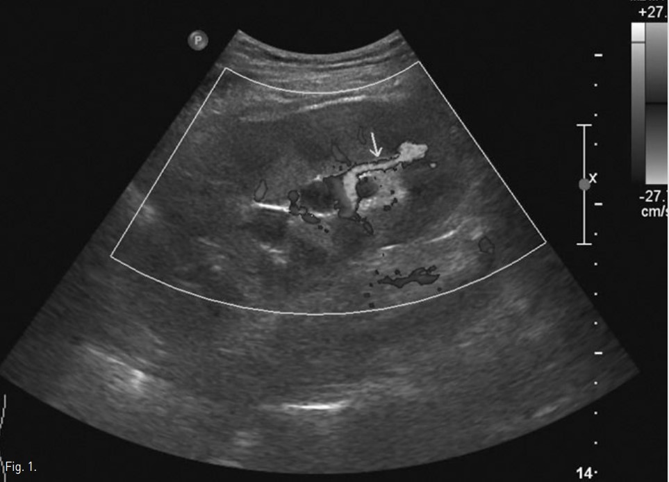 우하복부에 이식된 신장에 대한 초음파 검사상 신우, 신배와 요관의 확장과 함께 요관 원위부에 직경 15mm의 후방 그림자를 동반한 고에코 병변이 관찰되었고, 이는 원위부 요로 결석에 의한 수신증으로 진단되었다. 아울러 color doppler 초음파상 이식신의 하극(lower pole)에 혈액 와류(turbulent blood flow)가 관찰되고 분절동맥과 분절정맥의 연결과 함께 분절동맥 확장이 관찰되어 arteriovenous fistula도 진단되었다.