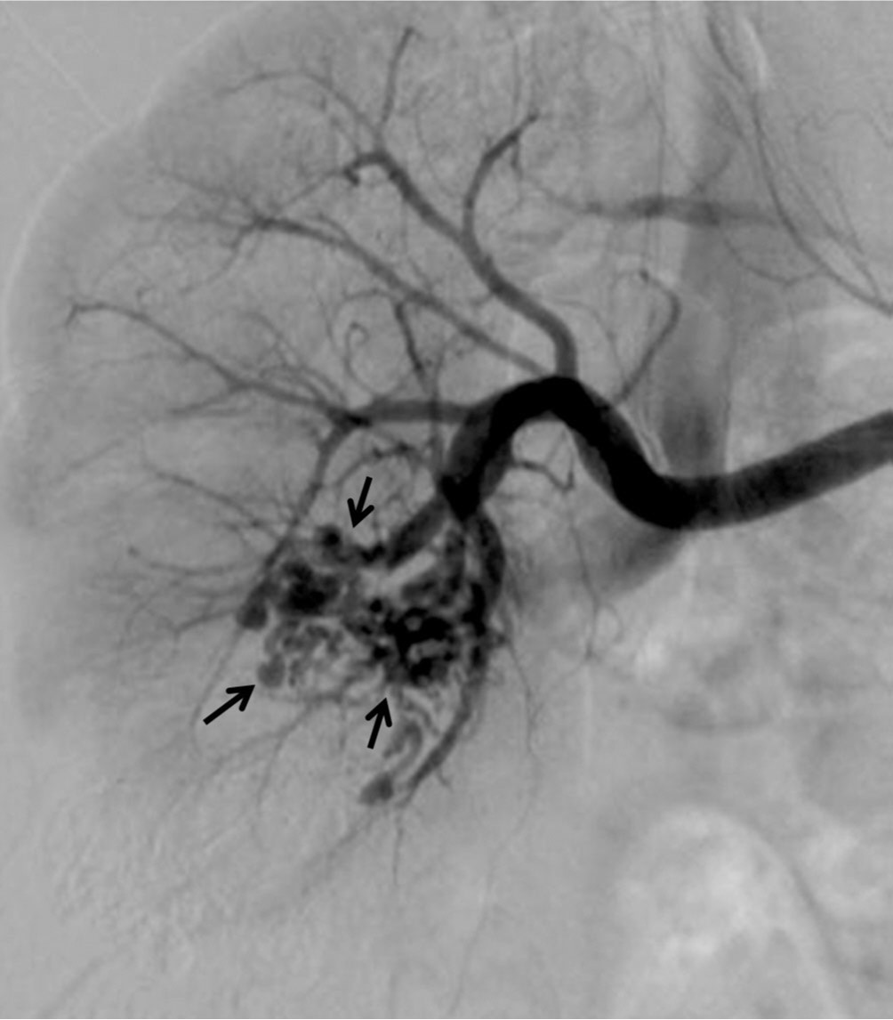 Fig. 2. Right renal arteriogram shows a network of tangled hypervascular structures (arrows) with early venous drainage.