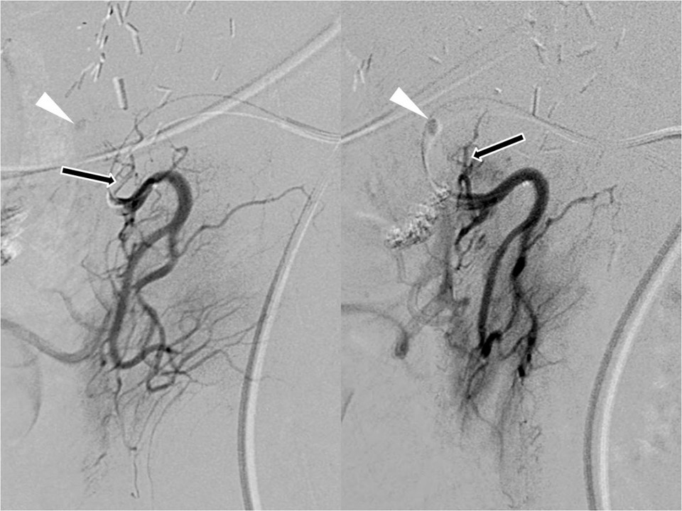 Selective pancreaticoduodenal arteriograms confirm that the feeding artery of the pseudoaneurysm (arrowhead) is the first branch (arrow) of the pancreaticoduodenal artery. But, the feeding artery arises from the parent artery with acute angle.