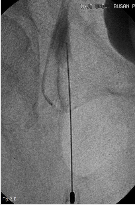 좌측 총대퇴동맥을 천자한 후 0.035-inch guidewire(Terumo, Tokyo, Japan)와 5F cobra catheter(Cook, Bloomington, USA)를 이용하여, 카테타를 우측 외장골동맥에 위치시킨 후 우측 하지 혈관 조영술을 실시하였다. 혈관조영술상 우측 총대퇴동맥의 내측대퇴회선동맥 기시부 직상방에서 기시하는 다엽성의 가성동맥류가 관찰되었다. 이를 동축기법을 이용하여 2.0F microcatheter(Progreat, Terumo, Tokyo, Japan)와 0.014-inch guidewire(Boston scientific, Natick, USA)를 이용하여 가성동맥류 내로 진입하였으나, 좁은 목으로 인해 미세카테타가 충분히 안정적으로 진입되지 않았다. 그리하여 21G Chiba needle(A&A medical, Seoul, Korea)로 초음파 유도하 에 가성동맥류를 경피적 천자하여 3% Thromboject(Omega, Canada)을 주입했으나 빠른 혈류속도로 인해 색전이 유발되지 않았다. 우하지 혈관으로의 색전물질 유출을 막기 위해 좁은 목에 5F Cobra catheter를 걸고 다시 fluoroscopy 유도 하에 N-butyl-2-cyanoacrylate(Histoacryl, B. Braun, Melsungen, Germany)와 리피오돌 1:4 혼합액 5ml를 천천히 주입하면서 가성동맥류에 대한 색전술을 시행하였다. 시술 직후 우하지 원위부로의 색전물질 이동 확인을 위해 오른 하지에 대한 혈관조영술을 실시하였으나 족부 혈관까지 이상 소견 발견되지 않아 시술을 종료하였다.