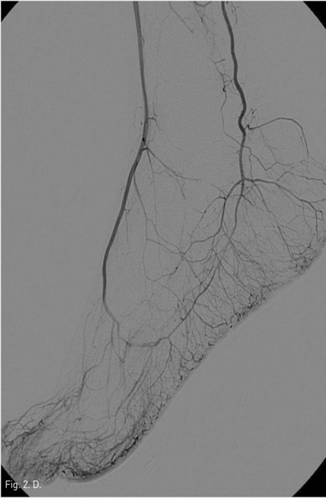 Fig. 2C, D. Final right lower extremity angiograms show complete obliteration of pseudoaneurysm in the right common femoral artery with no embolism to the distal part of the right lower extremity arteries.