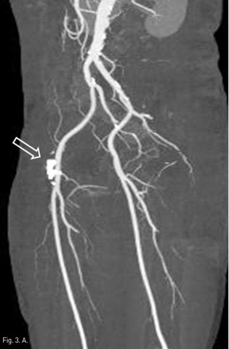 우측 넓적다리의 부종 평가를 위해 시행한 골반 CT에서 우측 총대퇴동맥과 연결된 1.4 x 4.0 x 5.5cm 크기의 가성동맥류가 관찰되었으며, 그 목(neck)은 0.4cm로 가늘었다. 그 주변으로 우측 넓적다리에 미만성 부종이 동반되어 있었다.