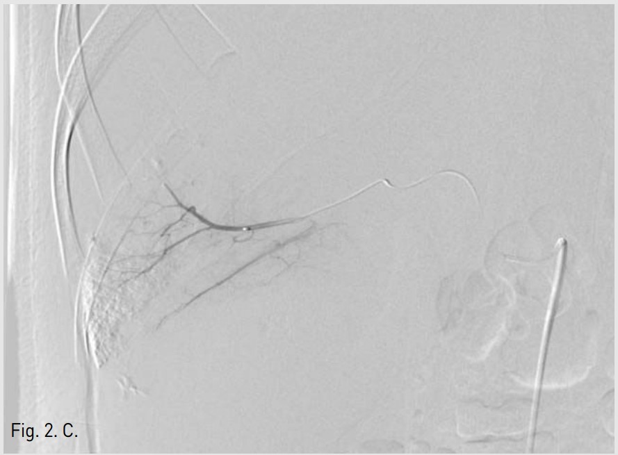 Fig. 2C. After selective catheterization of multiple bleeding arteries with a microcatheter, embolization was performed by using gelatin sponge.