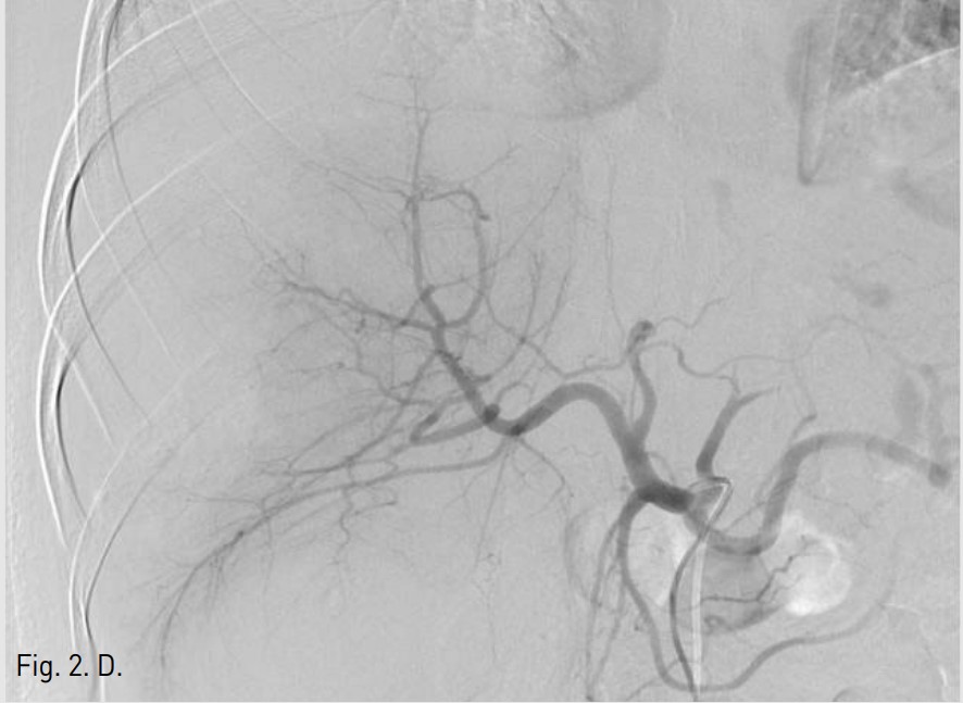 5F RH catheter (Cook, Bloomington, USA)를 이용하여 바로 시행한 간동맥조영술에서 right posterior inferior hepatic branch에서 급성출혈이 관찰되었다(Fig. 1B). 2.9F coaxial microcatheter(Stride, ASAHI, Aichi, Japan) 로 출혈혈관부위를 초선택한 후 gelatin sponge(Cutanplast, Mascia Brunelli , Milan, Italy)을 이용하여 색전술을 시행하였다(Fig. 1C). 시술 다음날 혈색소 수치는 10.0g/dL로 증가하였다. 그러나 시술 2일 후 환자의 활력징후는 혈압 131/80mmHg, 맥박수 82/min로 안정적이었지만, 혈색소가 7.8g/dL로 급격히 감소하였고, 우상복부에 심한 통증을 호소하여 재출혈의 의심하에 복부 CT검사를 시행하였다. CT검사에서 간에 다량의 피막하 혈종이 관찰되었지만, 조영제의 혈관외 유출은 보이지 않았다(AAST grade Ⅲ)(Fig. 2A). 같은 날 시행한 간동맥 혈관조영술에서 기존 색전술을 시행한 동맥에서의 재관류는 없었지만, 새로 생긴 다른 부위의 피막하혈종 내로 광범위한 다발성 미세출혈이 관찰되었다(Fig. 2B). Microcatheter를 이용하여 각 출혈부위 근처의 segmental artery들을 선택한 후 gelatin sponge를 이용하여 광범위한 부위에 색전술을 시행하였고, 더 이상의 출혈은 관찰되지 않았다(Fig. 2C, D). 시술 후 환자의 혈색소는 정상화되었고 우상복부 통증은 점차 감소하였다. 이 후 뚜렷한 합병증 없이 입원 1달 후 퇴원하였다.