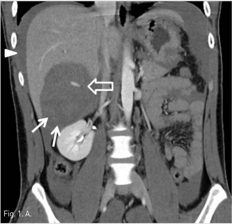 Fig. 1A. Initial coronal CT scan shows a large subcapsular hematoma (arrows) with extravasation of contrast media (open arrow) inferior to the right hepatic lobe and perihepatic fluid collection, indicating hemoperitoneum (arrowheads).