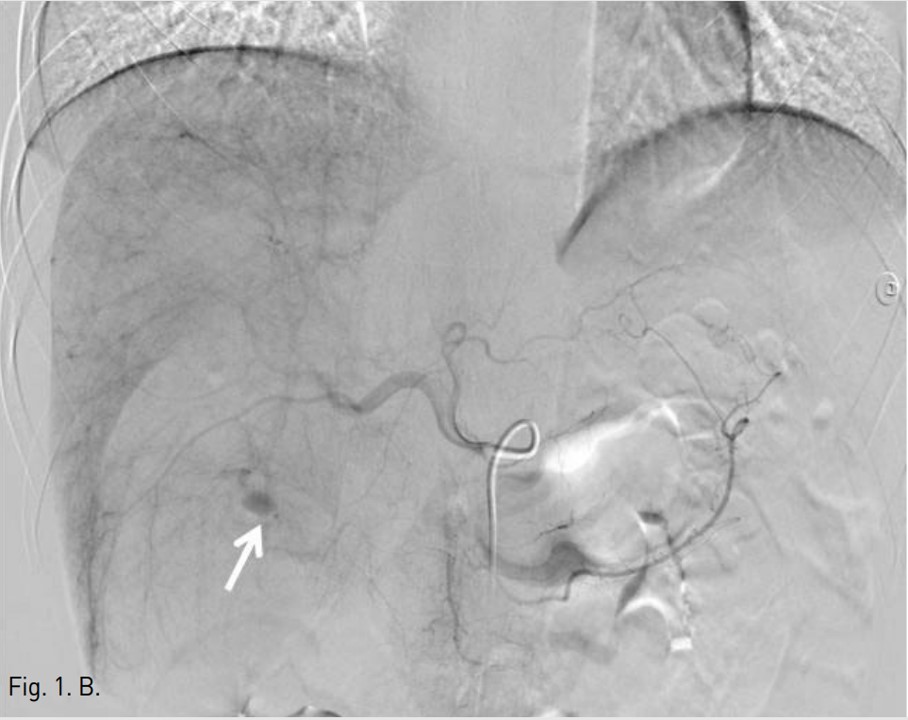Fig. 1B. Celiac angiogram shows active bleeding (arrow) from a branch of the right hepatic artery. After selective catheterization of the bleeding artery with a 2.9 F microcatheter, the artery was embolized by using gelatin sponge.