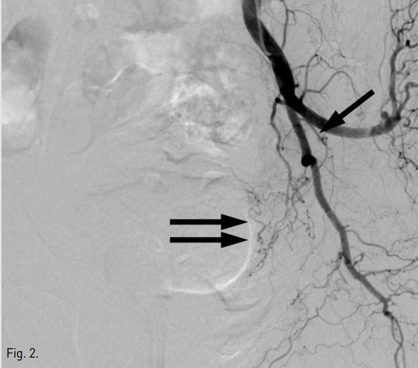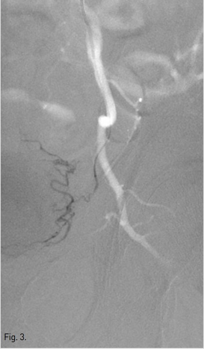 방광을 희석된 조영제로 채운 후 얻은 좌측 내장골동맥조영 사진에서 좌측 아래방광동맥(inferior vesical artery)이 두드러지게 커져 보임(Fig. 1, 2). 우측 내장골동맥조영 사진에서는 이상소견 보이지 않음.
