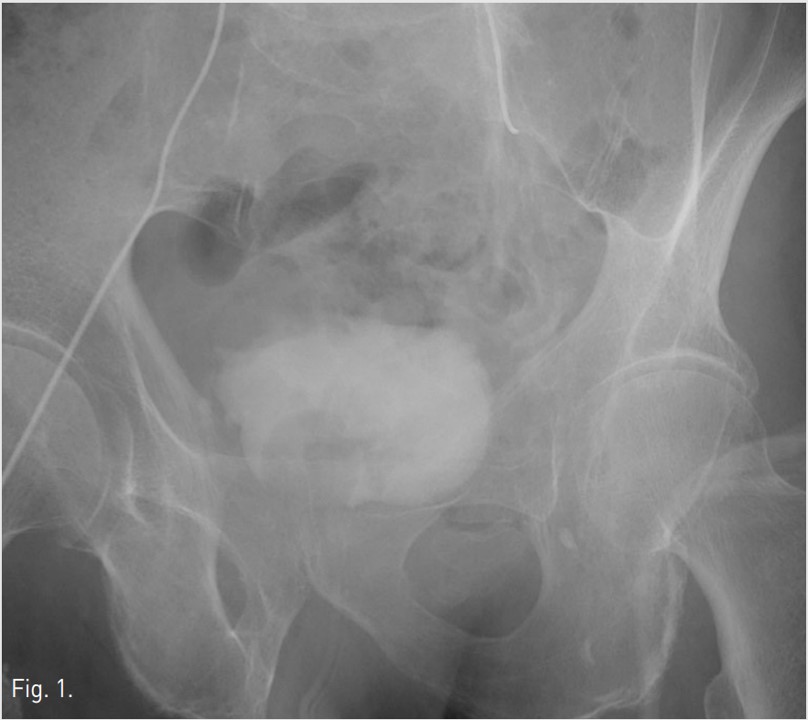 Fig. 1. The spot image shows the distended urinary bladder, filled with the diluted contrast media injected through a Foley catheter.