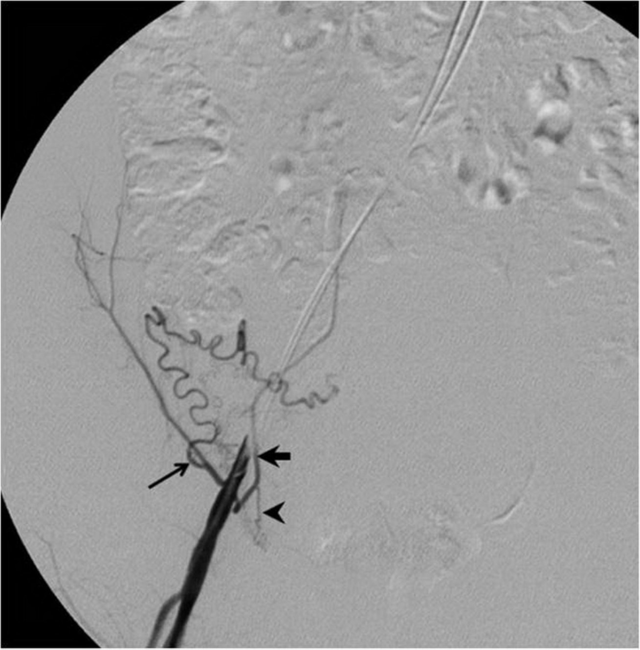 Fig. 2A-C. Pelvic angiogram (A) shows the tortuous and dilated left uterine artery (arrow) and atrophy of the right uterine artery. An aberrant ovarian collateral (arrowhead) originates from the right external iliac artery. Selective right external iliac angiogram (B) reveals the aberrant ovarian collateral (thin arrow), right inferior epigastric(thick arrow), and right round ligament(arrowhead) arteries. Selective aberrant ovarian collateral angiogram (C) demonstrates that the collateral supplies blood flow to the right half of the uterus as well as the right ovary (arrow).