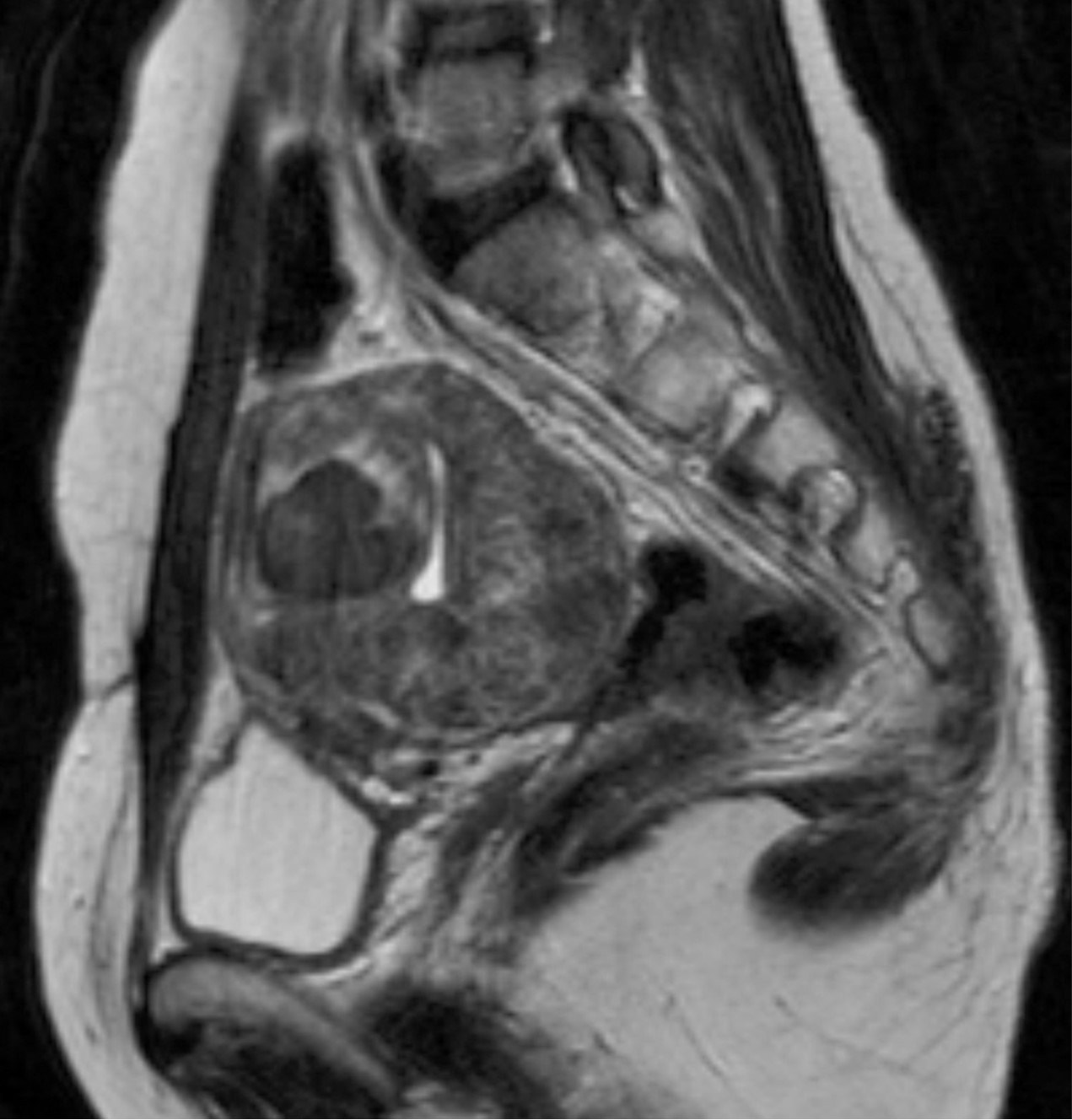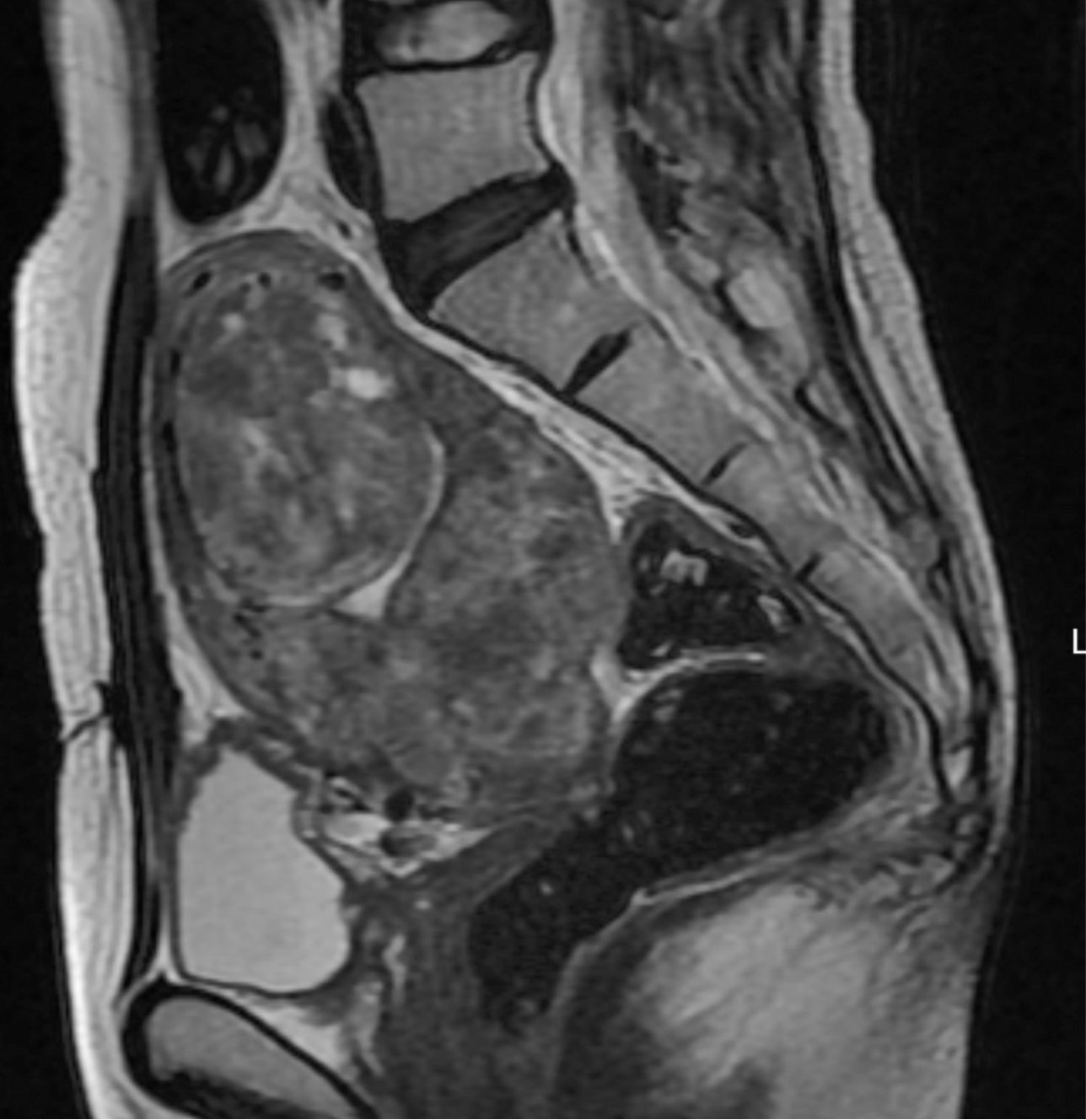Fig. 1. T2-weighted sagittal MR image shows multiple submucosal and intramural uterine myomas, with the largest one measuring 6.1 x 4.2 x 5.9 cm.