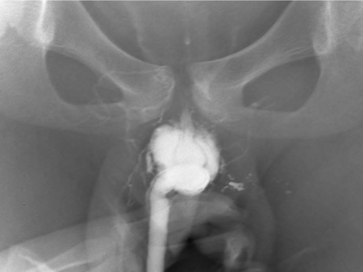 특이 과거력 없는 13세 남환으로 철봉에서 떨어지면서 회음부(perineum)를 부딪힌 이후 혈뇨로 내원하였다. 도뇨관 유치(foley catheter indwelling) 시도하였으나 실패하였고, 소변이 나오지 않아 시행한 역행성 요로 조영술(Retrograde urethrogram)(Fig. 1)에서 요로 파열 (urethral rupture)이 관찰되어 방광루(cystostomy)를 형성하였다. 지속발기증(priapism) 소견을 보여 CT(Fig. 2) 및 도플러 초음파(Fig. 3)를 시행하였고 양측 음경 동맥해면체(arteriocavernosal fistula)가 관찰되었다.