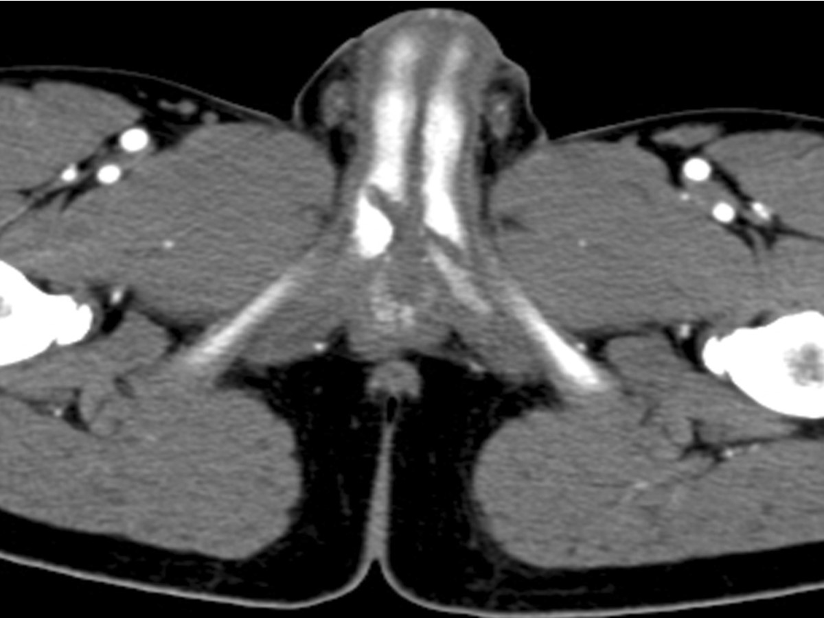 지속발기증(priapism)이 있어 CT를 촬영하였고 구부요도 (bulbous urethra) 부위의 양쪽 음경해면체에 사선모양으로 연결되는 선 모양의 낮은 감쇄 병변이 보여 양측 음경해면체의 파열(bilateral corpus cavernosal rupture)을 의심하였다(Fig. 2).