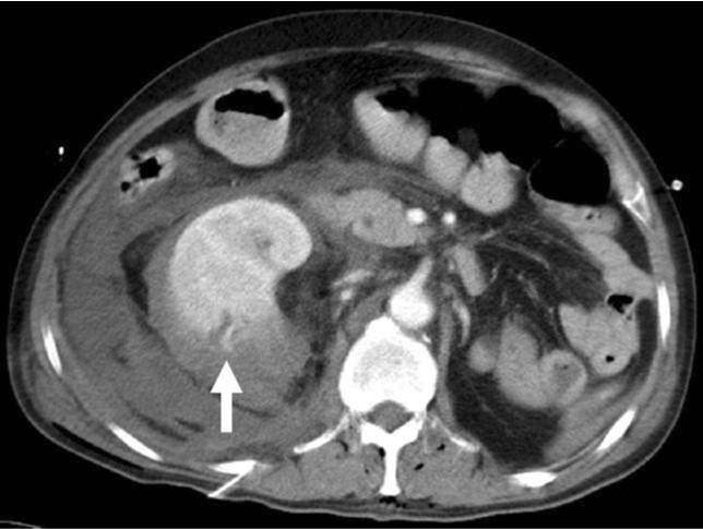 Fig. 2. Contrast-enhanced CT on 12 days after admission showed a distinctly abnormal leakage of contrast (arrow) within the mid portion of right kidney and a large amount of perirenal hematoma.
