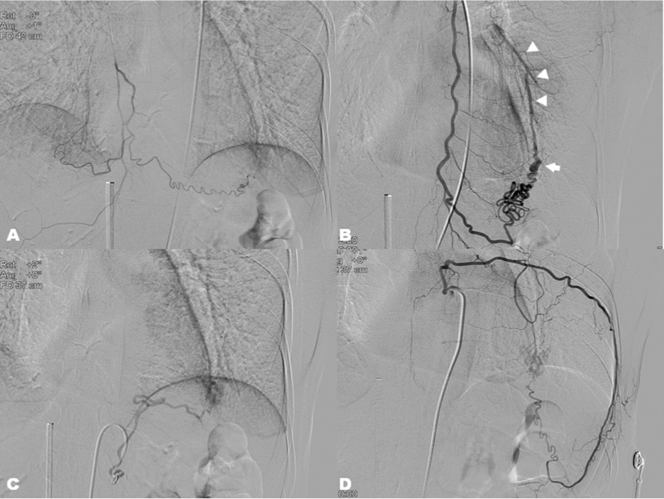 Selective embolizations for (A) right internal mammary artery, (B) left internal mammary artery, (C) left inferior phrenic artery, and (D) left 8th intercostal artery were performed to occlude systemic arterial inflow into the malformation.