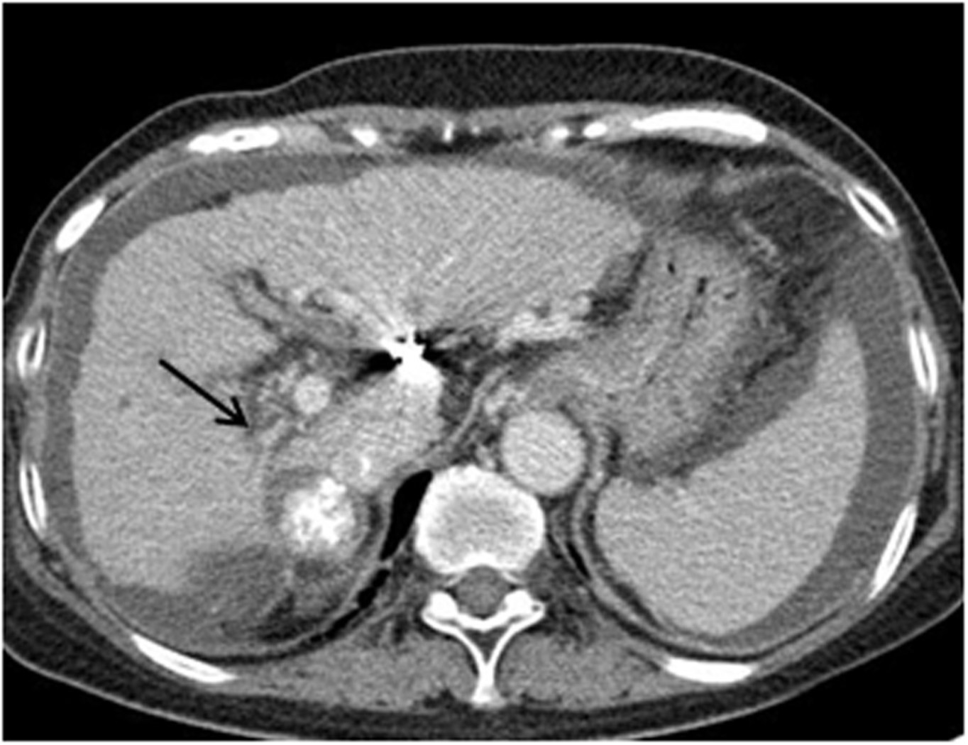 Fig. 1. Portal phase of contrast enhanced CT scan shows atrophic change of the right hepatic lobe and narrowing of the right portal vein(arrow). Lipiodol laden HCC mass is seen near the right portal vein.