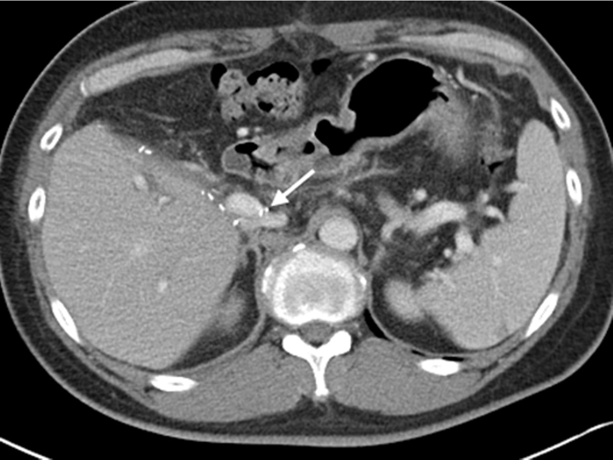 6 months after embolization of hemiportocaval shunt using vascular plug. Follow up enhanced abdomen CT shows vascular plug (arrows) between portal vein and inferior vena cava.