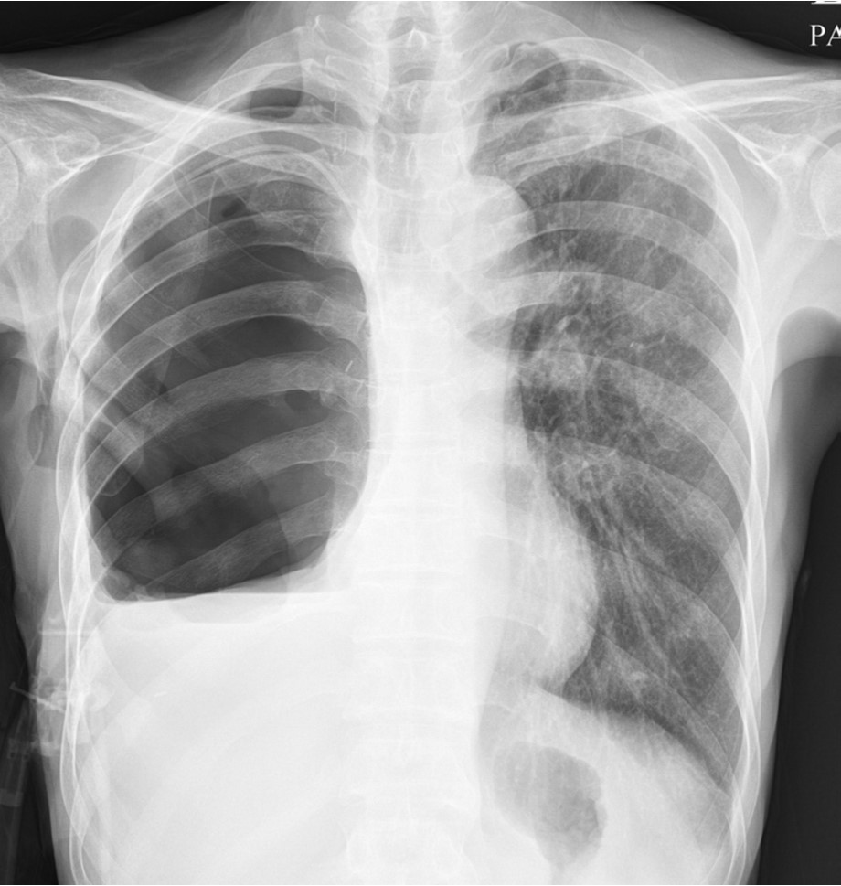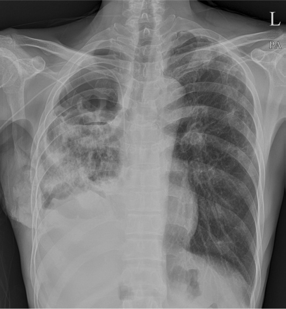 Chest radiograph after right upper lobectomy show deadspace of right thoracic cavity and multifocal consolidation at right lower lobe.