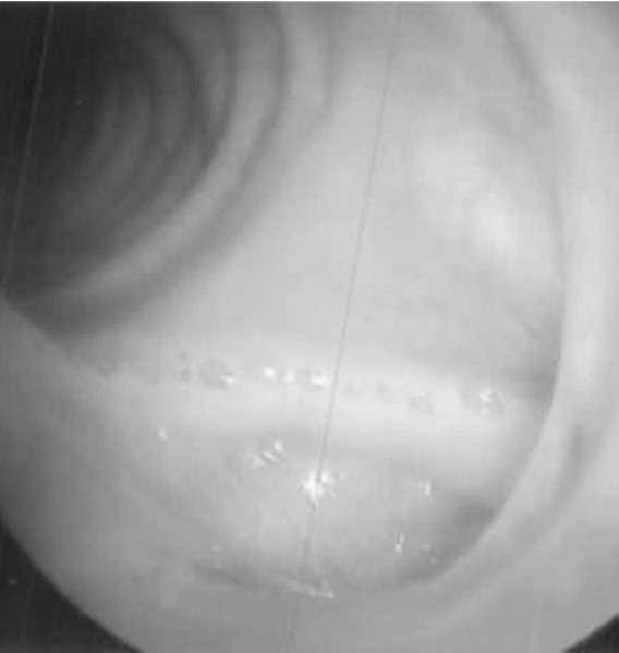 Reintervention - 호흡에 따라 스텐트의 모양이 유지되지 못함에 따라 일주일 후 스텐트를 제거하고 flexible part의 구조를 보강한 스텐트를 삽입하였다. 스텐트 제거를 위한 bronchoscopy상에서 carina 부분에 놓여있던 flexible part의 실리콘 코팅에 hole이 생긴 것을 확인할 수 있었으며 (Fig, 6) 13 F sheath와 hook wire를 이용하여 스텐트를 제거하였다. 새로 삽입한 스텐트는 tracheal part 의 직경이 24 mm, bronchial part의 직경이 14nm, 총 길이는 90 mm였으며 시술 후 fluoroscopy 상에서 호흡에 따른 collapse 없이 flexible part에서 스텐트의 직경이 잘 유지되고 있었다 (Fig. 7). 시술 후 15일째 단순흉부촬영에서 스텐트의 migration, collapse 등의 문제가 발생하지 않은 것을 확인할 수 있었다 (Fig. 8).