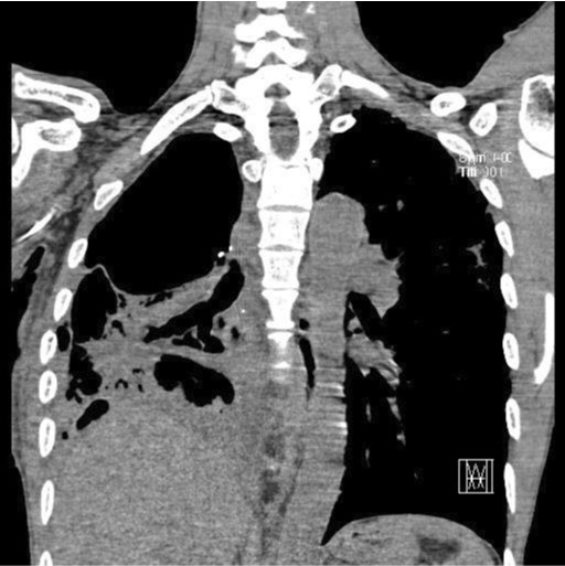 Coronal CT image shows a bronchopleural fistula between right upper lobar bronchus and deadspace.