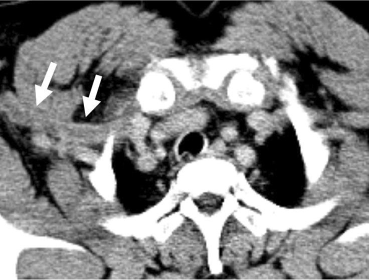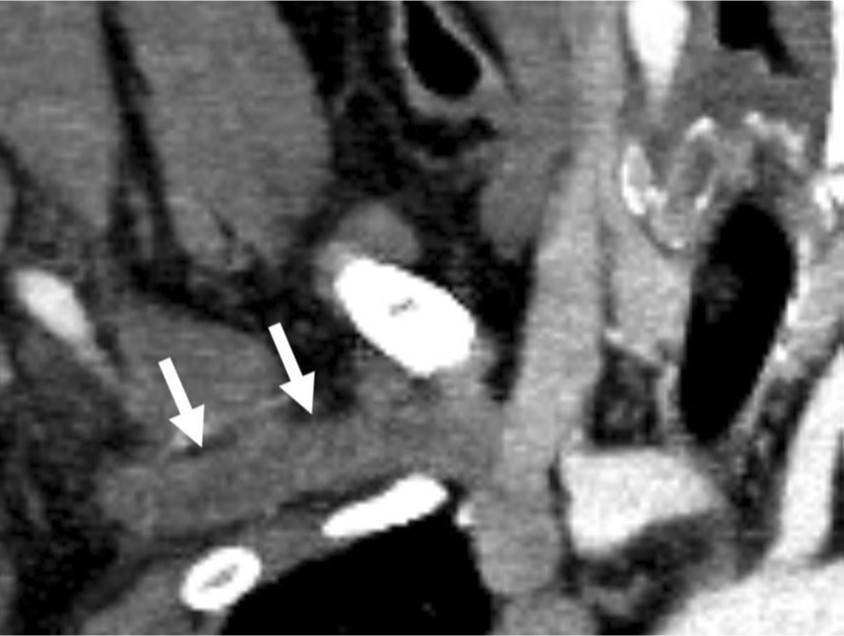 시술 후 1년 동안 항응고요법 (anticoagulation treatment)으로 와파린 5mg을 복용하였다. 1년 후 시행한 조영증강 CT에서 쇄골하정맥을 포함한 우측 상지 심부정맥에 보였던 혈전은 없어졌고 부종도 호전되었다(Fig. 4).