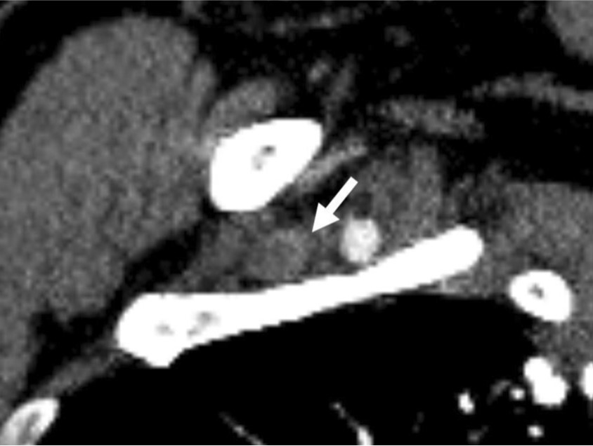 Axial CT image after one year shows good patency of right subclavian vein without evidence of residual thrombosis