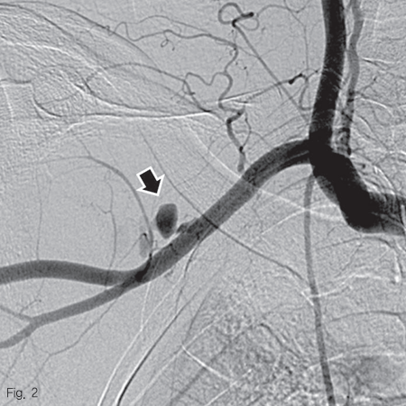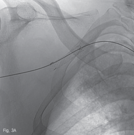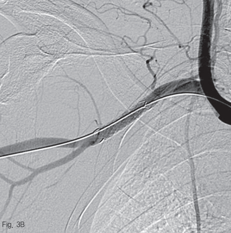 우측 대퇴동맥을 천자하여 5 Fr sheath를 거치 후, 0.035 인치 guidewire (Terumo Corp., Somerset, NJ, USA)를 이용하여 5 Fr Headhunter catheter (Cook Medical, Bloomington, IN, USA)를 팔머리동맥 근위부에 위치시킨 후 동맥 조영술을 시행하였다. 우쇄골하 동맥과 액와 동맥의 경계 부위의 위측에 조영제의 혈관외유출과 이로 인한 가성동맥류 형성을 확인하였다 (Fig. 2). 조영제 유출이 보이는 동맥의 직경은 약 6.2 mm 였으며, 거치된 카테터를 통해 Amplatz super stiff wire (Boston scientific, Natick, MA, USA)로 교체 후, 이 부위를 8 mm 직경의 4 cm 길이 자가팽창 covered 스텐트-그라프트 (vascular stent-graft, TaeWoong Medical, Gimpo, Korea)를 삽입하였다 (Fig 3A). 시술 후 우쇄골하 동맥조영술을 시행하였을 때 조영제 유출은 보이지 않았으며 (Fig. 3B), 우측 흉견봉동맥, 외측흉동맥, 견갑하동맥의 혈류가 잘 관찰되었다.