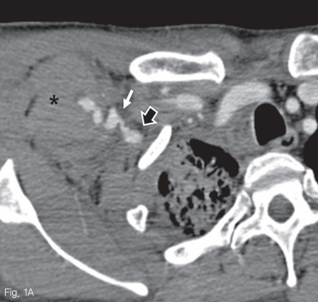 Contrast enhanced CT angiography A. and maximum intensity projection image B. show active extravasation of contrast media (A, B: white arrows) from anterolateral aspect of right subclavian artery (black arrow, A), forming a large hematoma in the right anterolateral chest wall and axilla (asterik, A)