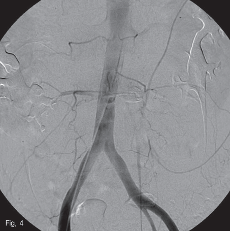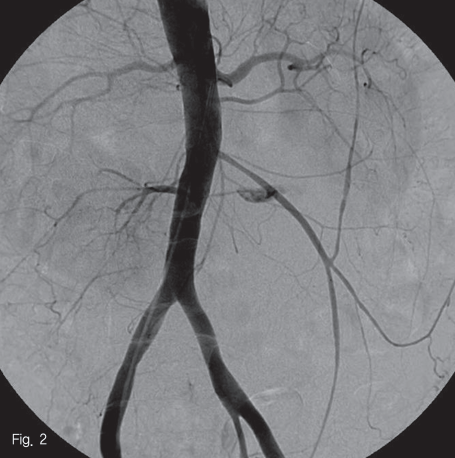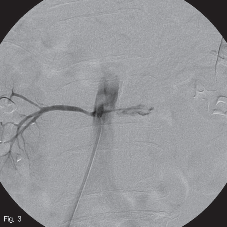 우측 대퇴동맥을 천자 후 5F straight catheter(Radifocus, Terumo, Tokyo, Japan)를 이용하여 시행한 대동맥 조영상 하부장간동맥 기시부 직하방에서 앞쪽으로 마제신의 양측 협부를 공급하는 좌,우 분지동맥이 공동동맥(common truck)을 이루고 있고 좌측 분지에서 현성 출혈로 판단되는 거짓동맥류가 있었다(Fig.2). 5F RH catheter(Cook, Bloomington, U.S.A)를 사용하여 공동동맥(common truck)를 선택하여 시행한 angiogram에서 좌측 분지에서 기원하는 거짓동맥류를 확인하였다(Fig.3).