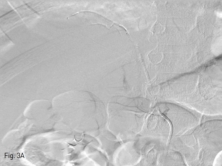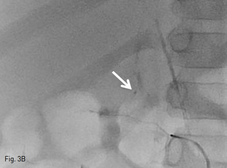 이후 4Fr cobra catheter를 통한 추적 오른쪽 아래가로막동맥조영술에서 상, 중 부신동맥에 대한 색전은 잘 확인되나, 하 부신동맥을 통한 혈류 흐름이 확인되었다 (Fig. 3A). 이에 하 부신동맥에 대한 보다 자세한 평가를 위해 microcatheter를 사용하여 하 부신동맥을 초 선택하였고, 선택적 조영술 상에서 오른쪽 부신의 하부 실질이 확인되나, 활동성 출혈이 있는지 여부는 확실히 배제할 수 없었다. 이에 Gelfoam (Alicon, Zhejiang, China)을 이용하여 색전을 시행하였다. 그러나 시술 과정 중 작은 가성동맥류가 확인되어 (Fig. 3B), NBCA와 Lipiodol 혼합물을 사용하여 추가 색전술을 시행하였다. 이후 추적 오른쪽 아래가로막동맥조영술에서 혈관 외 유출이 없음을 확인하고 시술을 종료하였다 (Fig. 4).